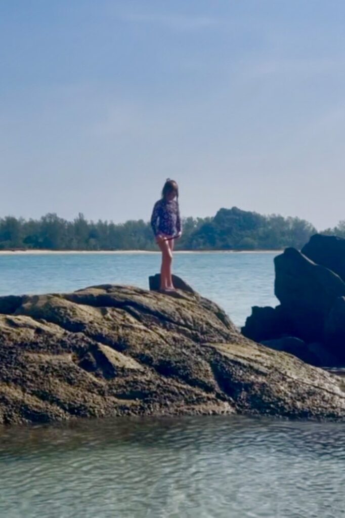 A young girl standing on a large, dark rock formation in the middle of clear turquoise water at Koh Phra Thong beach.